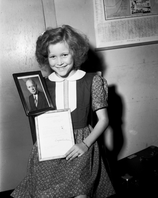 Alice Pearl Gatliff, 8, shows a big smile with picture signed and sent to her by General Dwight Eisenhower. She is also holding a framed letter.