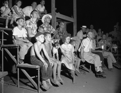 Shot of softball spectators on the bleachers at Sycamore Park. They seem to be looking up in the air. Spectators range from children, parents to grandparents.