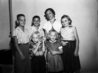 A child in need will receive a quart of milk a day for more than a month from the money little John McFadden has in the jar. The children who earned $8.25 with a recent milk and ice benefit talent show are Donna McFadden, standing with John, and John Edward Gilliam, Ramon DeArman, Betty Gilliam and Judy, back left to right. The benefit was held at the home of Mr. and Mrs. R. E. Harper 1404 East Davis.