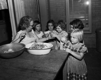 Series on the All-Church home. Mrs. Joseph Kingsbery, business administrator, dishes out fruit or cinnamon bun to orphaned children.