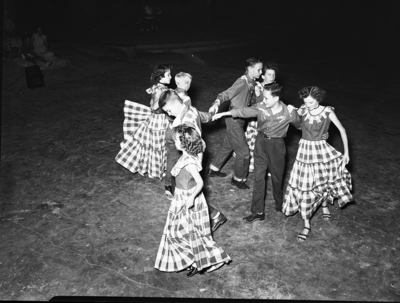 Judy Stephenson, Darlene Henderson, Dianne Stephenson, Sandra Rogers, Paul Widener, Wayne Youngblood, Sid Stephenson and Edward Oliver squaredancing in Rockwood Park. The boys are wearing a western style top and the girls are wearing dresses with checkered skirt and collar.