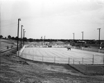 This is Nocona's new rodeo arena which will be opened Monday when the first Chisholm Trail Round-up is staged in the Montague County town. The RCA-approved rodeo will run through Wednesday. The arena fencing and pens are constructed of oil field pipe donated by oil operators of the area.