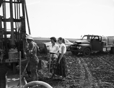 Fort Worth Desk ad Derrick Club, oil field tour. Two more members of Desk and Derrick Club, Edna Hanley, Cities Service, left and Merle Burguess, Sinclair Oil and Gas and Company, watch the drilling of one of the 50 to 70-foot holes used in the shooting the area. The holes are being drilled one-quarter mile apart.