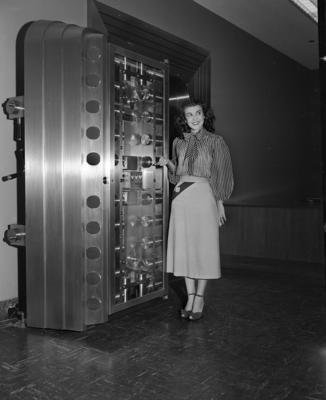 The 24000-pound vault door in the safe deposit department of the new Fort Worth National Bank is described as a "thing of beauty", not to mention the charms of Miss Monte Allen, department clerk, who points to time lock mechanism on the door.