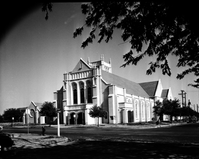 Polytechnic Methodist Church. Exterior Shot. The church has several stained glass cathedral windows.