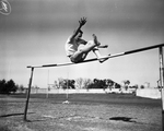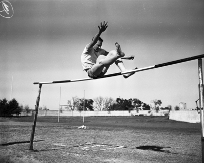 Tommy Myall of William James appears to be sitting on top of the bar but he slid over to win the Class A high jump championship in the Group A junior high school track meet at Farrington Field. Published in the Fort Worth Star-Telegram evening edition, April 5, 1950.
