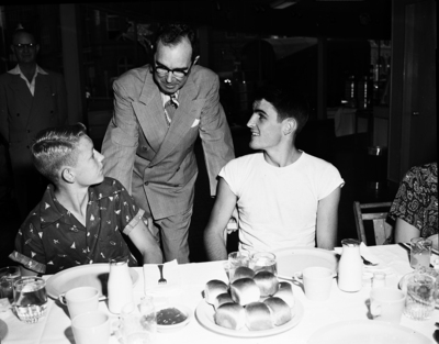 Malvern Marks, center, member of the Grand Council of DeMolay of Texas, was host Thursday to 54 West Texas boys for breakfast at the T and P Station. The boys were on their way to Waco for a state conclave. Left is Clint Hurt, master councilor of the Odessa chapter. Joe Carter, right, is master councilor of Midland DeMolays.
