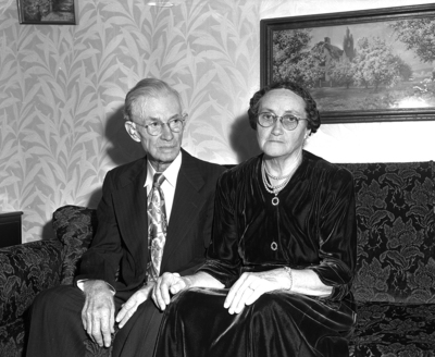 Mr. and Mrs. E. Hunt celebrate their golden wedding. The couple are seated on a couch.
