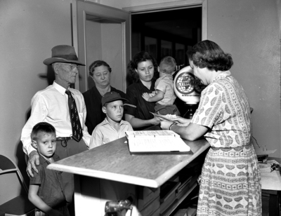 Mrs. Frances B. Gibson, right, director of the Fort Worth Travelers Aid Society, hands bus tickets to the Cassey family. The Casseys' were in Fort Worth Friday to attend the funeral of George C. Cassey. In foreground are Charley Lee, 5, left, and Alfred, 10, sons of the dead man. Back, left to right, are Mrs. George C. Cassey's parents, Mrs. Cassey, and another son, George Jr., 3.