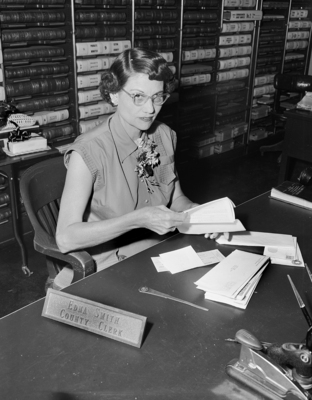 Series on Crane County Anniversary celebration. Mrs. Edna Heagy Smith shown at her desk. She is part of the County clerk at Odessa.
