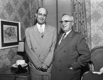 Early arrivals at Hotel Texas Sunday for the open house for out-of-town banker at the new Fort Worth National Bank building were J. O. Gillham, left, president, Brownfield State Bank and Trust Company, and David Collins, president, Levelland State Bank.