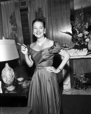 Singer Dorothy Shay, known for the song "Park Avenue Hillbilly goes to town "prefers "Stardust." Ms. Shay is shown flashing a smile posing in a silk dress, hand on hip and cigarette on the other hand.