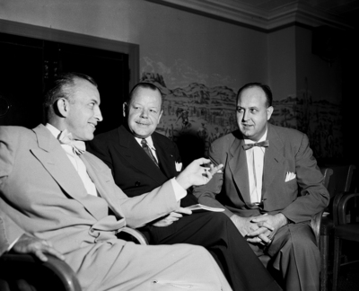 Dr. Dale Pearson, center, of Erie, Pennsylvania, inspector for the bureau of hospitals of the American Osteopathic Association, tells Dr. Milton Gafney of Dallas, left, and Dr. Roy Fisher of Fort Worth about his tour of Texas Osteopathic hospitals. Dr. Gafney is succeeding Dr. Fisher as president of the Texas Osteopathic Hospital Association. The doctors are seated and having a conversation.