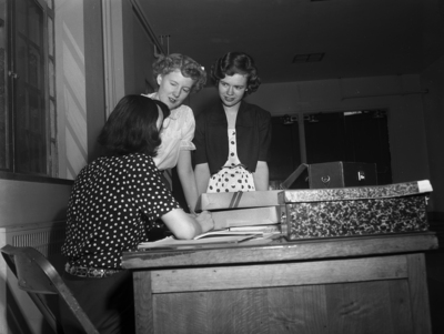 Margaret Ann Hodges, and Sallie Lou Butler, left to right, Paschal High School, seniors, were the first to enter garments at the Star-Telegram's Home Sewing Contest desk in the west entrance of Will Rogers Memorial Auditorium.