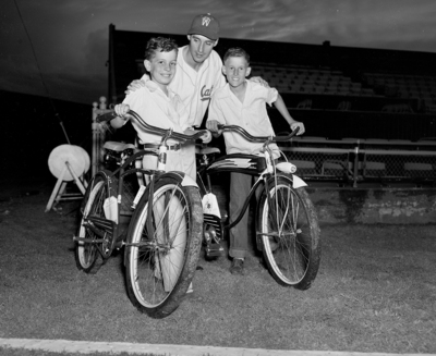 Jimmy Forester, 9, left, Cats' Joe Torpey, and Eddie Wood, 12, admire bicyles won for attendance with La Grave Field Knothole Gang. Eddie was first, Jimmy second. Published in Fort Worth Star-Telegram morning edition, September 02, 1952.