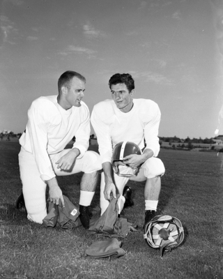 Sophomore Ronald Clinkscale and Marshall Robinson, right, Texas Christian University safety who suffered slight concussion, have been winning praise with great punt returns in drills. Published in Fort Worth Star-Telegram morning edition September 5, 1952