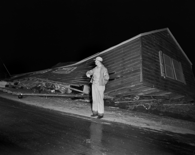 Damage done by flash storm in Lake Worth area. B. W. Taylor directs traffic near wreckage of the home of Mr. and Mrs. C. Astis Phillips. The five-room frame residence on Charbonneau Dr. was blown across the street.