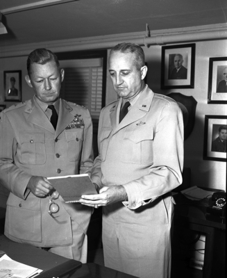 Major General S. E. Anderson, left, and Brigadier General Kingston E. Tibbetts, confer on repair operation on aircraft and equipment. Brig. Gen. is holding a notebook in his left hand.