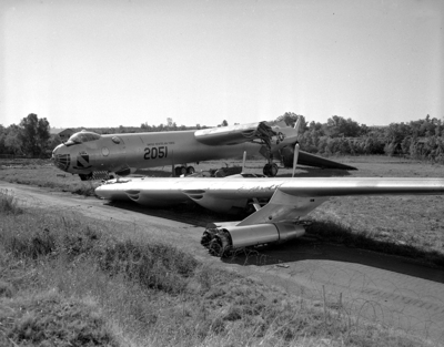 A damaged B-36 at Carswell Air Force Base. A strong storm tore the wing and tail off of an airplane that is sitting in a field.
