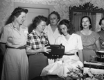 Mrs. J. T. Mays, Mrs. G. L. Ledingham, Mrs. R. E. Winger, Polly Riley and Mr. Bob Thomas, left to right, admire bag women golfers presented to Mrs. Ledingham, who leaves shortly on tour of Scotland. Mrs. Ledingham was luncheon honoree.