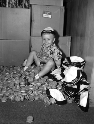 Bobby Blanketnship shown with caps and yo-yos to be given away by Leonard's Department Store. Bobby is sitting on a pile of yo-yos and campus. There are boxes behind the young boy. He's wearing a Leonards Department Store cap.