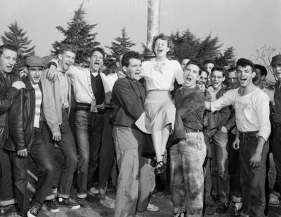 Holding the Texas Wesleyan College (TWC) freshman class queen beneath the flagpole where a frosh flag flew for the first time in eight years are Freshman Dale Howard of Detroit, left, and David Hoskins of San Angelo. Their right is the class president, Carroll Graves of 2552 E. Vickery. Hoskins is the one who went up the pole with the flag. Published in Fort Worth Star-Telegram evening edition April 3, 1950.