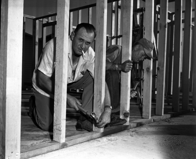 River Oaks Lions Alonzo Kellum, left, and Loyd Erwin drive home nails as club members raised the walls Wednesday of a house they are building to sell. The profit will be used for aid to needy families. It's a club project and members are donating time and labor. The two men are both kneeling down to hammer nails into support beams.