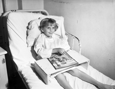 Happy at Hospital - Treatment and care at the Fort Worth Children's Hospital, a Community Chest agency, produced smiles on the faces of these young patients. In the picture is an 8-year-old victim of rheumatic fever who finds jig saw puzzles fun.