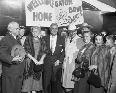 Carter Files. Mr. carter and others greet Texas Tech Coach Dewit Weaver and Tech players and rooters after victory in Gator Bowl. Left to Right, mayor Edgar Deen, Mrs. DeWitt Weaver, Weaver, Amon Carter, Mrs. Carter and Mrs. Tom F. Abbott. In Background is Tom Abbott and C. T. McLaughlin.