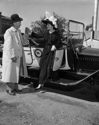 Dave Whitehead, dressed in derby and duster, helps his wife, attired in 1909 costume, out of the 1914 touring car the couple are to drive in a parade of antique cars Friday afternoon.