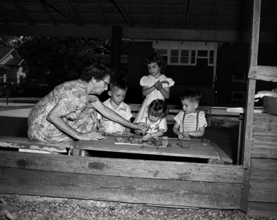 Fort Worth Day Nursery. Mrs. C. V. Herren helps youngsters mold clay. Four children are looking at an assortment of pieces of clay on a table. Mrs. Herren is leaning over the table helping a young child shape the clay in her hand.