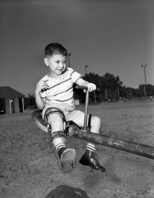 Series on Yates Day in Vernon. Tommie rides, the teeterboard at Sunshine Home, operated for the county by Mr. and Mrs. Ode Frost, showing his disabled leg.