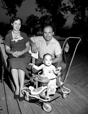 Stanolind Oil and Gas Company. Mr. and Mrs. Robert O. Hall and their son, Robert O. Junior. The couple are seated with their infant in a baby carriage.