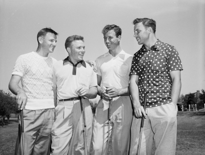 Southern Methodist and Texas Christian University golfers pose before starting a match at Colonial. Left to right are John Hanrahan, TCU; Raymond Mann, SMU; George Finley, SMU, and Doyle Malone, TCU. They halved doubles. Published in Fort Worth Star-Telegram evening edition March 4, 1950.