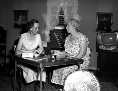 Mrs. J. E. Harrison, left, and Mrs. Grady C Addington, members of the Forest Hill Home Demonstartion Club, are discussing aluminum etching. They will train home demonstration club leaders during a craft school schedule for the week of September 22. The two women are seated at a table.