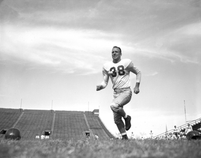 Southern Methodist University football team player, Bill Forester (38), is shown running in the middle of football practice.