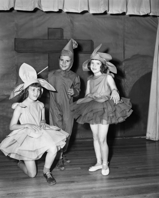 Three students, left to right, Linda Gayle Elam, James Youree and Linda Brewster at Thomas Place School. They carry out the Easter theme in costume as they portray "The Awakening of the Spring Flowers" in a program at the school. Published in Fort Worth Star-Telegram evening edition March 5, 1950.