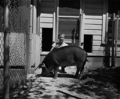 David Hilsher, of Arlington, with his Duroc Jersey gilt, which took first place Tuesday at the county Sears pig show. The young boy is squatting down behind his pig.