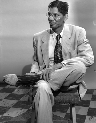 Mohammed Abdullah Khan of Pakistan wearing zari shoes. Mr. Khan is seated in a chair.