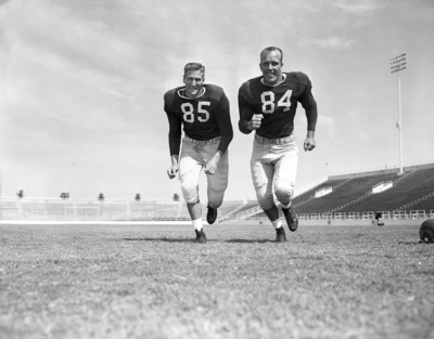 Johnny Crouch(85), left, and Wayne Martin (84), are shown running next to each other during football practice. They are both members of the Texas Christian University football team.