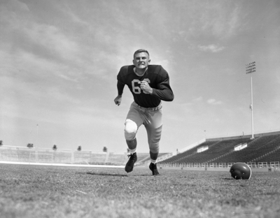 Mickey Teems, member of the Texas Christian University football team, is shown. He is running during football practice.