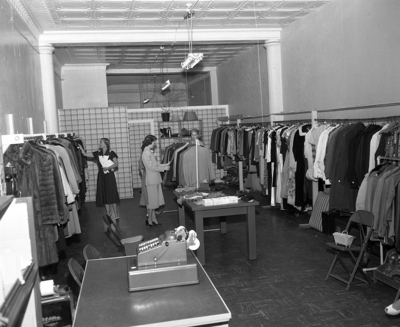 Interior shot of newly decorated Bargain Box store at 209 W. 11th Street. In the store are racks of clothing and there's a cash register in the foreground.