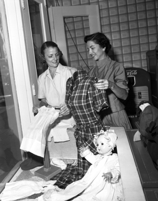 Mrs. Maltin Mitchell, left, and Mrs. James Edwards examining the window display in the Bargain Box store at 209 W. 11th Street. There is a dress, shoes, and a doll on display.