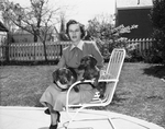 Mrs. Herman G. Cox, of 137 Williamsburg Lane, is shown holding a pair of champion dachshunds. The dachshunds are a father-daughter pair, with Voddy Dychland on the left, and Lady Dychland on the right. Published in the morning edition, April 16, 1950.