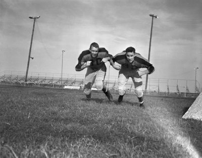 Two football players from Birdville High School are shown. They are Tom Watkins, left, and Roger Summers.