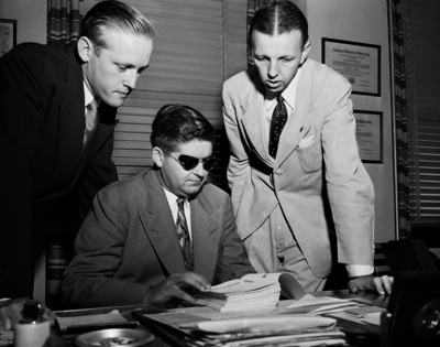 John Howard Griffin seated at a desk holds an unbound copy of his novel while Gordon Smith, left, and J. Hulbert Smith of Fort Worth look on.