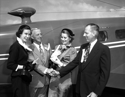 Mayor Edwards, second from left gets an invitation to the El Ranchito Indoor-Outdoor Polo tournament at Vernon from three Vernon boosters, Miss Jamie Holter, left, Mrs. Esta Lee Cook, and Ralph Holter. The group are standing next to an airplane.