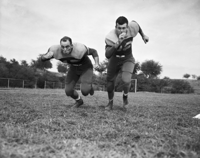 Don Cline, left, and Courtney Wood, are shown running next to each other. They are both team members of the Arlington Heights High School football team.