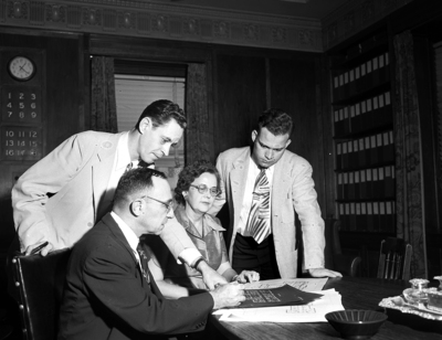 Cook Memorial Center of Children. Dr. Edwin G. Schwarz pediatrician, seated left, was in charge of a meeting Friday devoted to the development for W. I. Cook Memorial Hospital Center for Children. Studying blueprints with him are Dr. Ben Boynton, upper left, of Baylor University medical school faculty; Edson Jordan and Miss Allie Thomas.