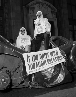 Shot of wrecked car with Howard Half and Bob Hilliard wearing skull masks. Both are holding signs with the words "If you drive wild you might kill a child." The crashed car also has a large sign with the same words.